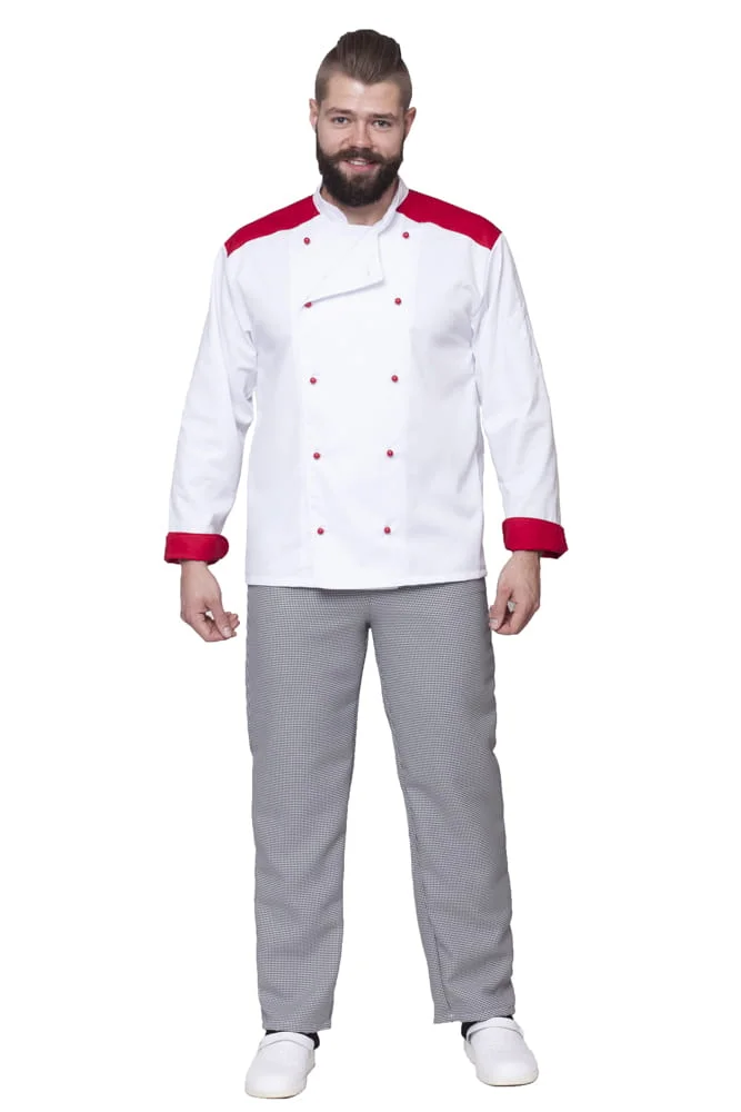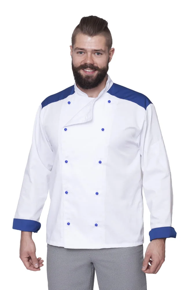 Inspirowana światowymi trendami, nowoczesna bluza kucharska dla wymagających. Asymetryczne zapięcie i wyraziste kolory dodatków sprawiają, że wyróżnisz się w każdej kuchni.