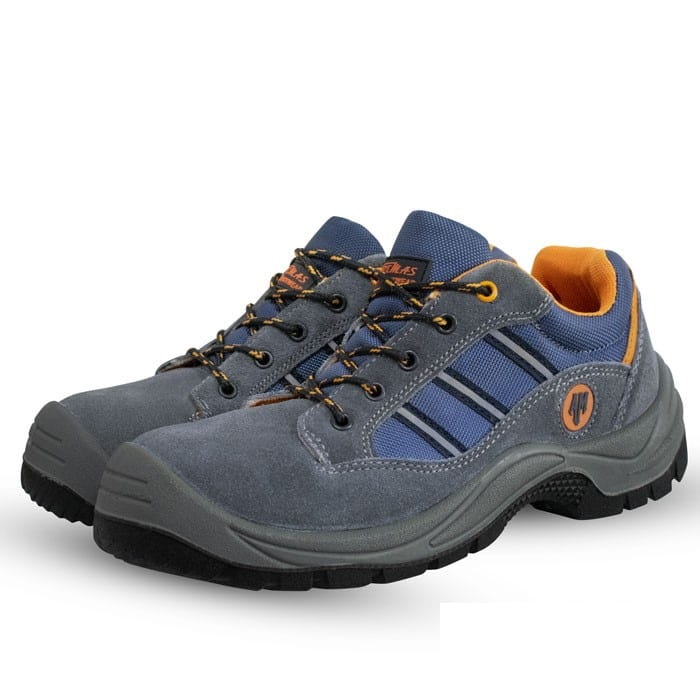 Buty robocze: półbuty bezpieczne z metalowym podnoskiem. Wykonane ze skór bydlęcych welurowych oraz tkaniny typu CANVAS. Elementy odblaskowe.