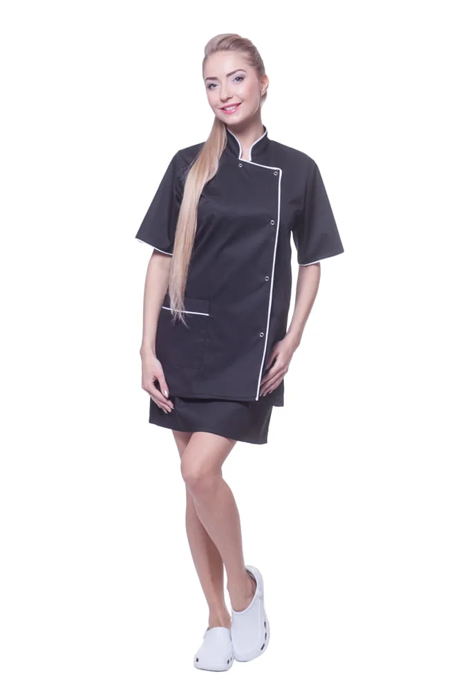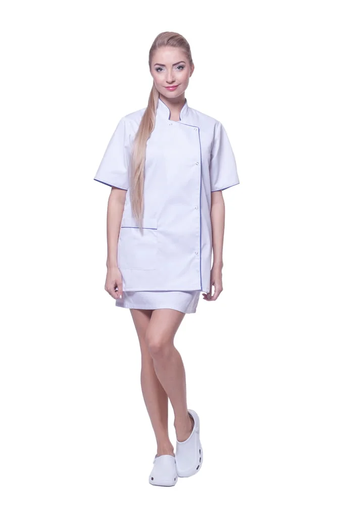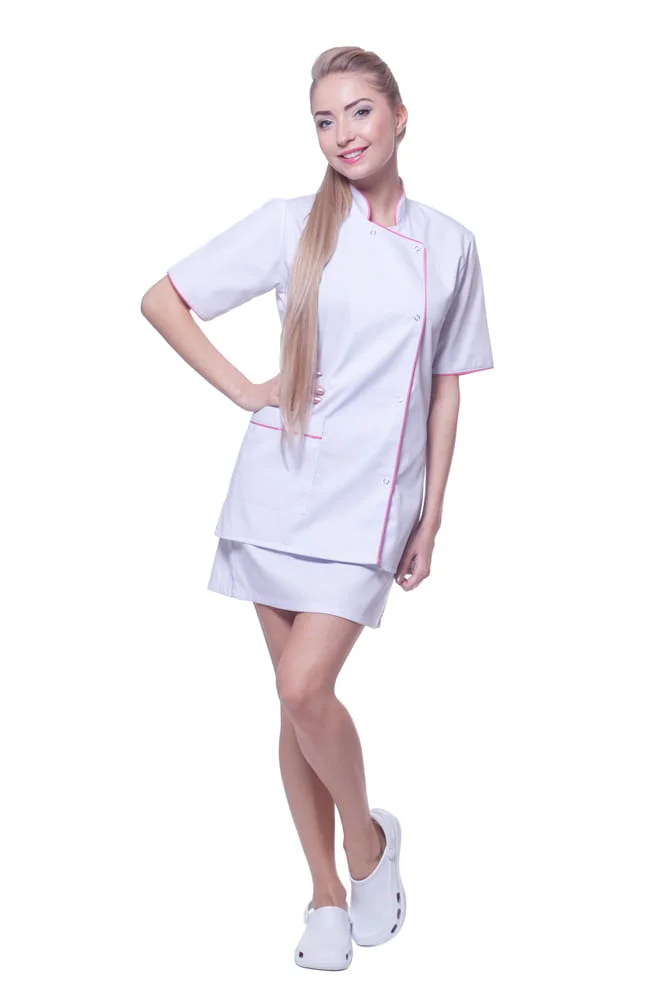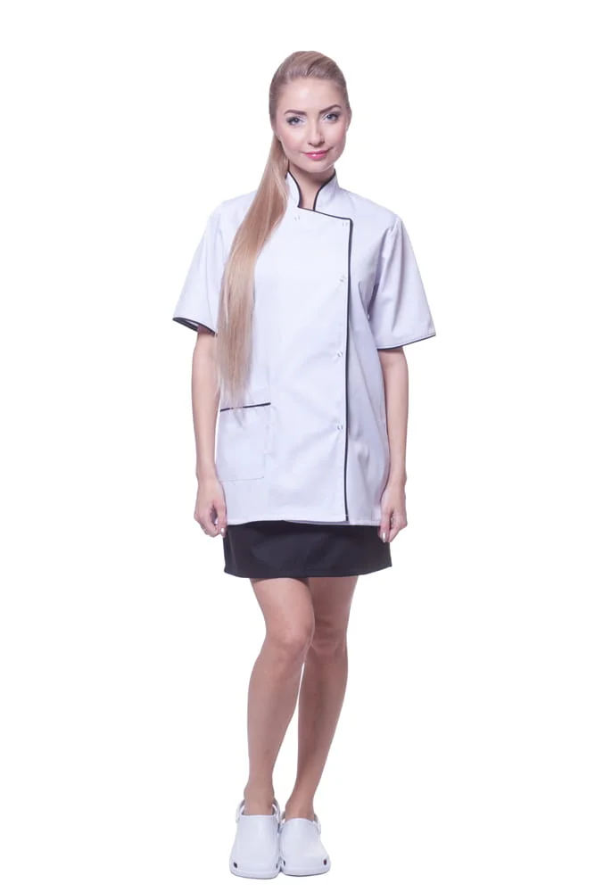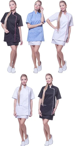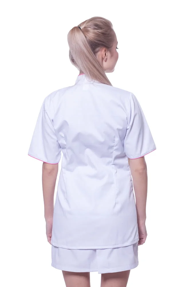 Wyróżnij się nowoczesnym stylem dzięki fartuchowi medycznemu Ala. Ten model o kroju żakietu z asymetrycznym zapięciem łączy w sobie klasyczną elegancję z modnym designem, stanowiąc idealny wybór dla personelu medycznego i kosmetycznego.