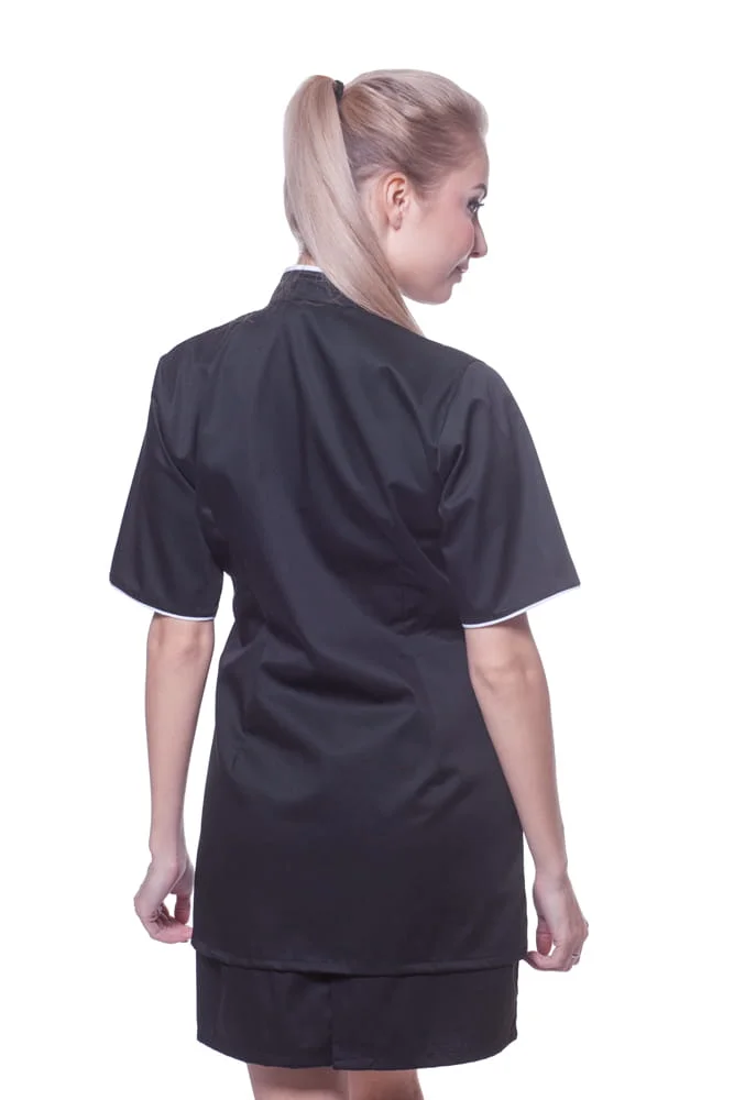 Fartuch został uszyty z wysokiej jakości elanobawełny, co zapewnia trwałość kolorów oraz łatwość w pielęgnacji. Taliowany fason ze stójką doskonale dopasowuje się do sylwetki, a krótki rękaw zapewnia komfort pracy nawet w cieplejsze dni.