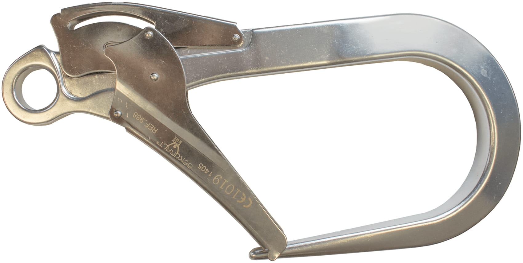 Hak 988 wyposażony jest w automatyczny zatrzask typu due-lock z podwójnym zabezpieczeniem, co minimalizuje ryzyko przypadkowego otwarcia. Spełnia rygorystyczne wymagania normy EN 362, gwarantując najwyższą jakość i niezawodność. Duży prześwit (110 mm) umożliwia łatwe wpinanie i wypinanie z różnych punktów zaczepienia.