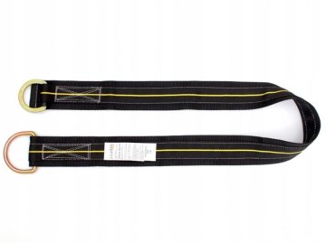 Taśma kotwicząca CTA02/1,5M to wytrzymały pas o długości 1,5 m i szerokości 60 mm, wykonany z poliestru. Posiada dwa zintegrowane stalowe pierścienie w kształcie litery D, które umożliwiają bezpieczne połączenie użytkownika z punktem kotwiczenia.