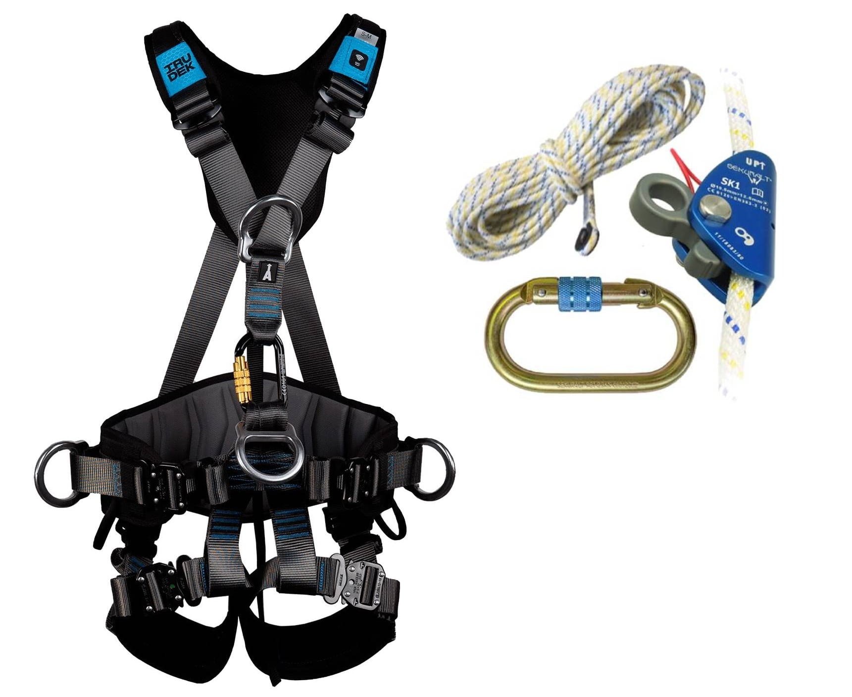 IRUDEK Zestaw asekuracyjny dla Fotowoltaiki - urządzenie samozaciskowe + szelki Expert 3PRO + lina