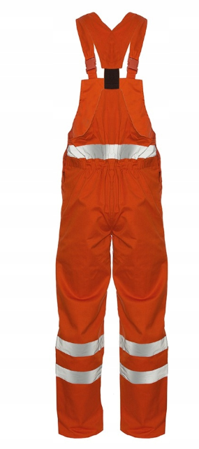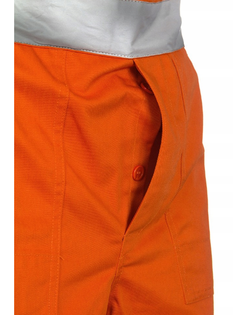 Wysoka widoczność dzięki podwójnym pasom odblaskowym na nogawkach i dodatkowej taśmie w pasie.