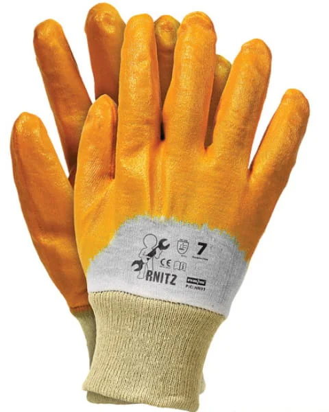 Rękawice ochronne RNITZ to solidny wybór do prac, w których Twoje dłonie narażone są na kontakt z olejami, smarami czy paliwami. Część chwytna oraz połowa wierzchniej strony została oblana wytrzymałym nitrylem w kolorze żółtym, co zapewnia doskonałą barierę ochronną oraz wysoką odporność na uszkodzenia mechaniczne, takie jak ścieranie czy przebicia.