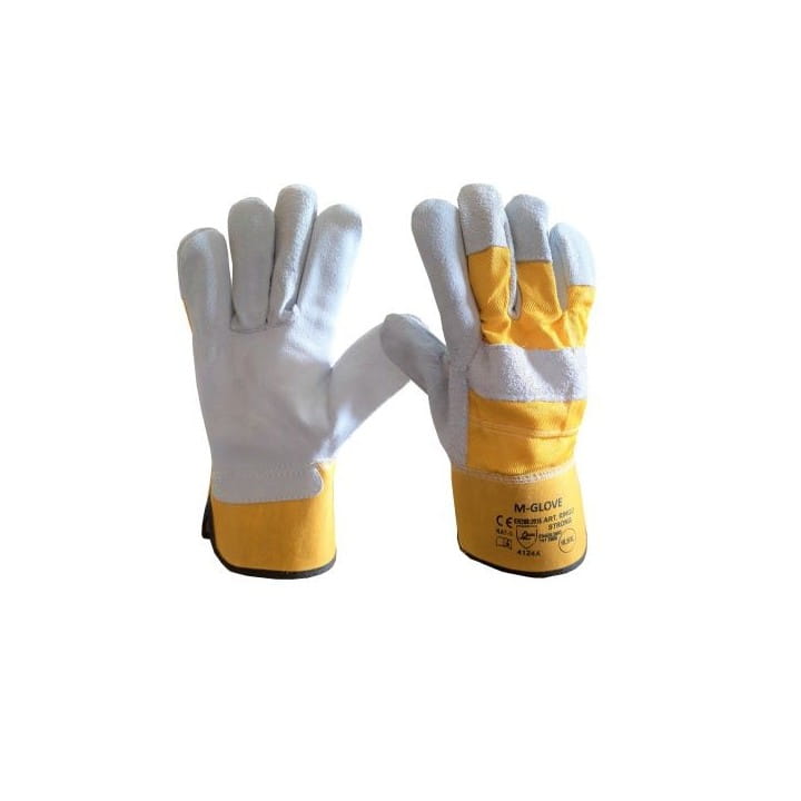 Rękawice ochronne z dwoiny, całodłonicowe. Dostępne w kolorze szarym / żółtym drelich. Podgumowany sztywny mankiet.