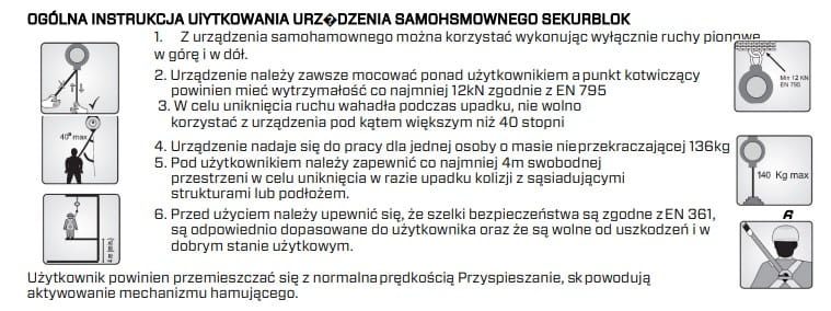 Sekurblok 10m wyróżnia się mechanicznym hamulcem, który zapewnia szybkie i bezpieczne hamowanie w przypadku upadku. Urządzenie ogranicza siłę uderzenia do 6 kN i jest certyfikowane do pracy pionowej z maksymalnym obciążeniem 140 kg.