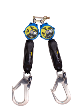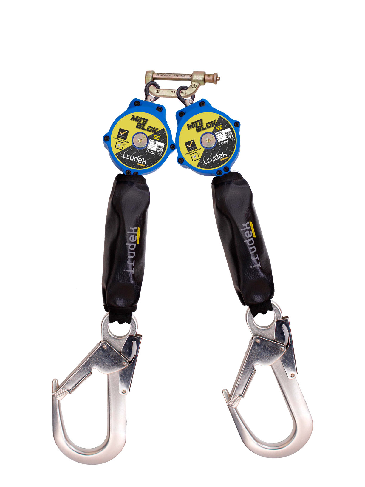 Urządzenia samohamowne są na stałe zintegrowane z płytą tylną uprzęży, co tworzy podwójną zwijaną linkę. Dzięki temu rozwiązaniu praca na wysokości staje się bezpieczniejsza i bardziej komfortowa dla pracownika.