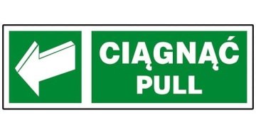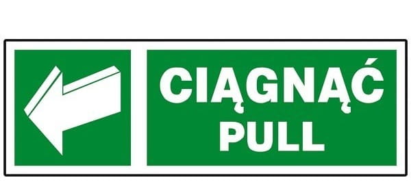 Znak ewakuacyjny „Ciągnąć Pull”.